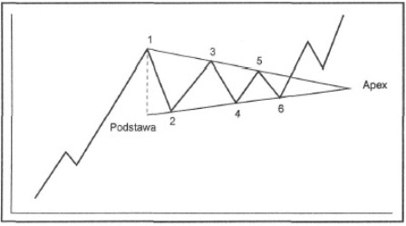 Podstawowe formacje kontynuacji trendu (kolejno: trójkąt, klin, prostokąt, flaga, chorągiewka):