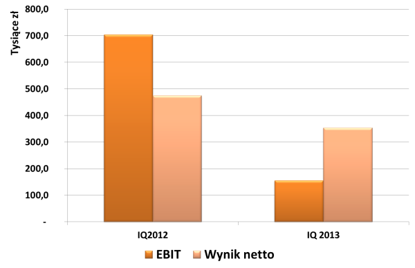 W pierwszym kwartale 2013 roku Spółka wypracowała 155 tys. zł zysku na poziomie operacyjnym i 354 tys. zł zysku netto przy ponad 8,66 mln zł przychodów ze sprzedaży. Okres ten, w porównaniu do analogicznego kwartału poprzedniego roku był gorszy pod względem powyższych danych finansowych, kiedy to Emitent osiągnął 475 tys. zł zysku netto, 704 tys. zł zysku z działalności operacyjnej przy ponad 10,15 mln zł przychodów ze sprzedaży. Podane dane finansowe wskazują iż przychody ze sprzedaży spadły o blisko 15% natomiast wynik netto o 25,5%. Wskaźnik marży netto w IQ 2013 roku odnotowano na poziomie 4,09% (IQ 2012 r. – 4,68%). Zarząd jako najważniejsze przyczyny pogorszenia wyników osiągniętych w IQ 2013 roku w porównaniu do analogicznego okresu roku poprzedniego podaje warunki atmosferyczne – przedłużająca się zima spowodowała konieczność przeniesienia zaplanowanych prac w ramach prowadzonych projektów oraz zaobserwowane pogorszenie się koniunktury na rynku nieruchomości w Polsce, a także konieczność wpłaty kaucji w kwocie 300 tys. zł na zabezpieczenie terminowej płatności czynszu dzierżawionej nieruchomości.